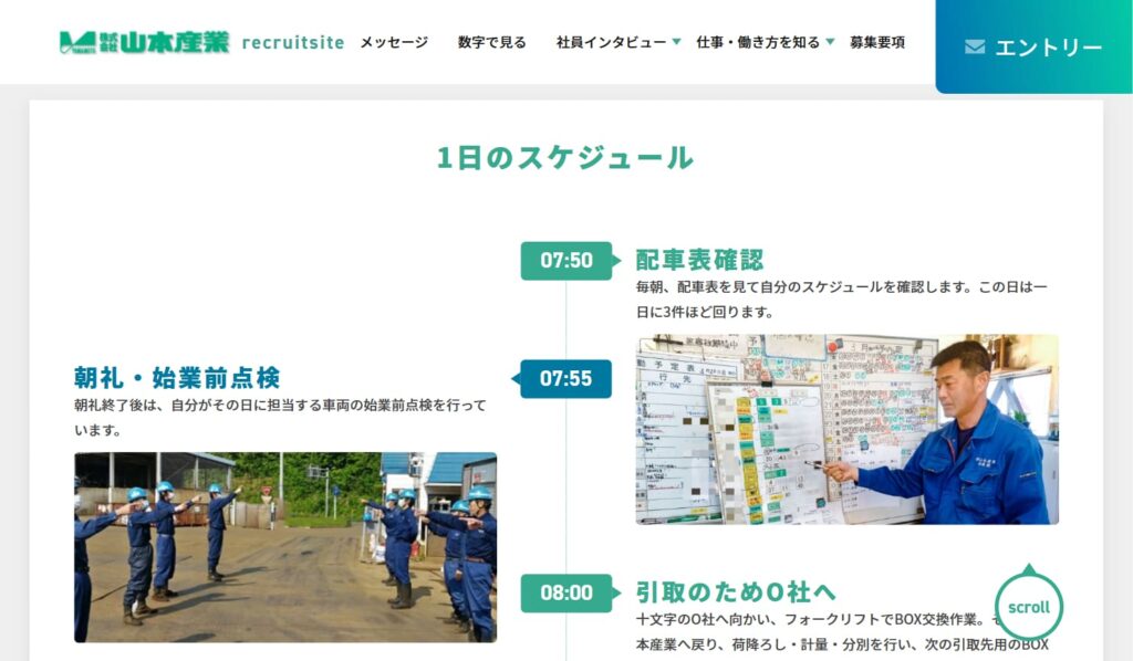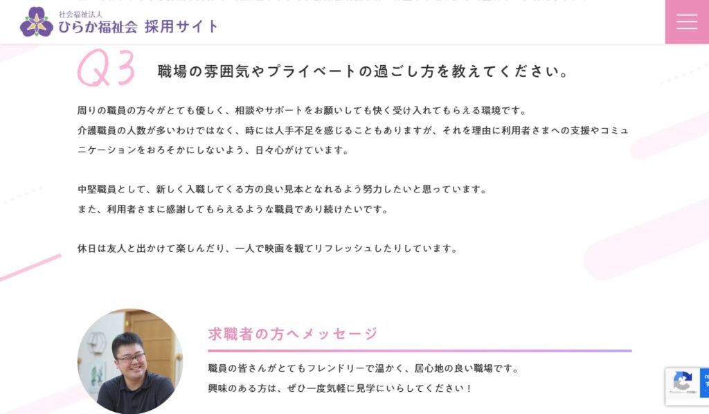 → リアルな仕事紹介・現場スタッフの声・1日の流れ などがあると、求職者に安心感を与えます。