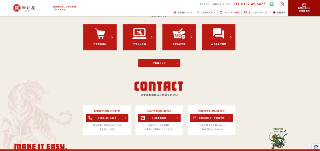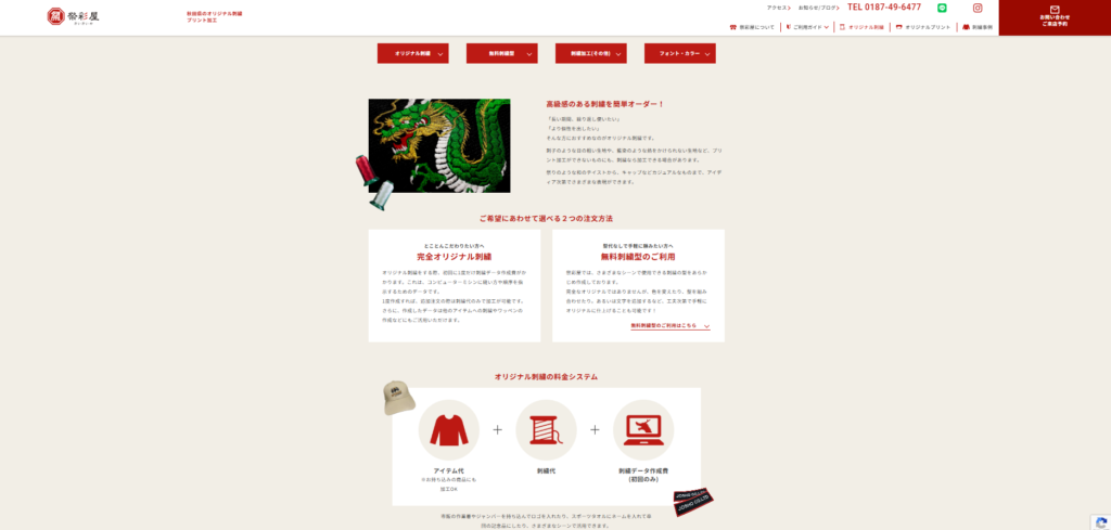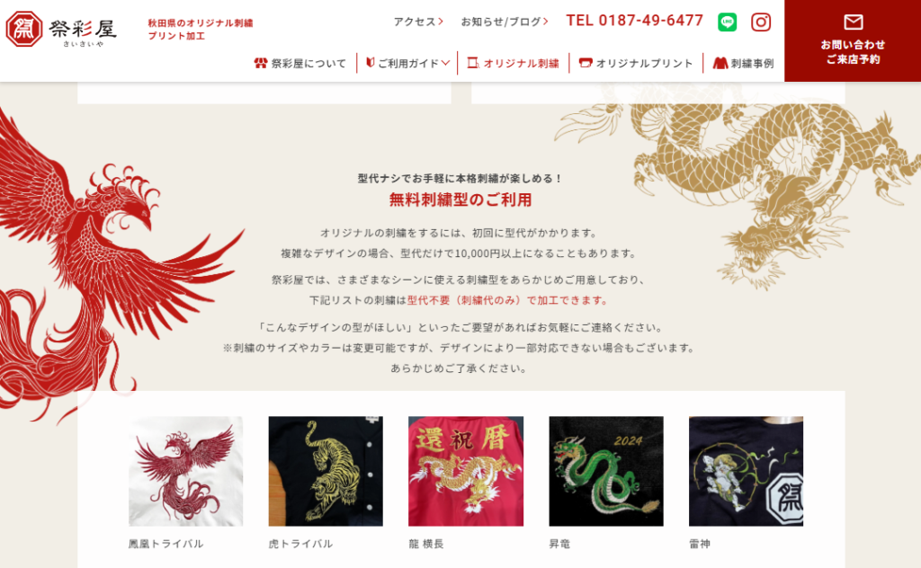 祭彩屋様の最大の強みである「和風の粋な刺繍」を直感的に伝えるため、フリー素材ではなく実際過去に制作された刺繍デザインのイラストをご提供いただき、サイト内の装飾(あしらい)として贅沢に使用しました。